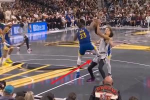 在上一场对勇士比赛的第四节,文班在进攻中遭遇追梦和波杰姆的前后包夹,波杰姆倒地时一记扫腿绊倒了文班,被吹防守犯规;